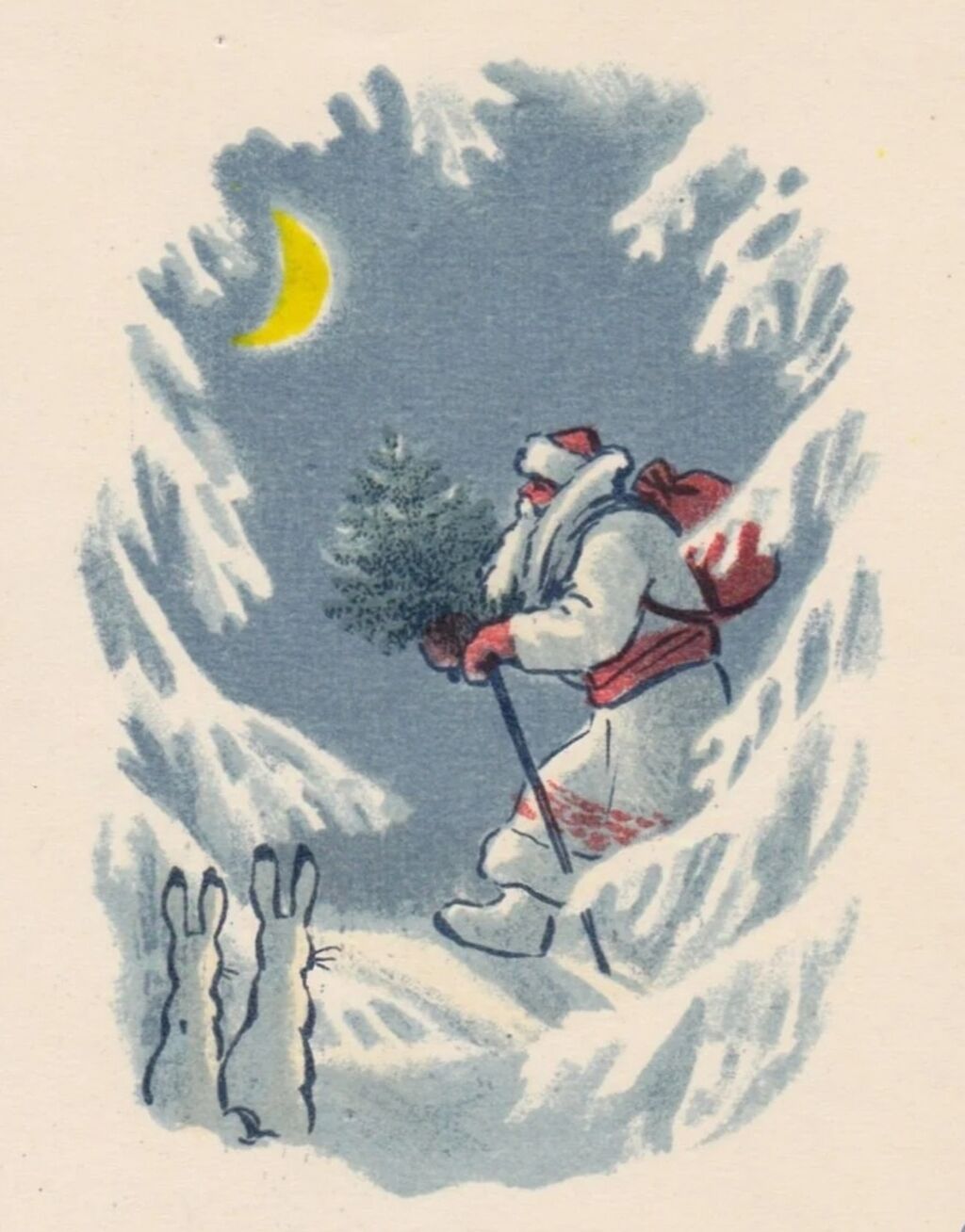 Давно уже встретили его во Владивостоке. B Маньчжурии наши отсутствующие друзья прокричали «ура». Вот прогремело «ура» в Новосибирске, в Свердловске, в светлом Ташкенте. Вот уж идет он по Замоскворечью, и на Красной площади, над незыблемой Спасской башней, над древними Фроловскими воротами начинают играть куранты. Уже слышно сквозь их золотую музыку легкое поскрипыванье снега под расписными валенками. Еще не видно, кто там идет. Каков он?