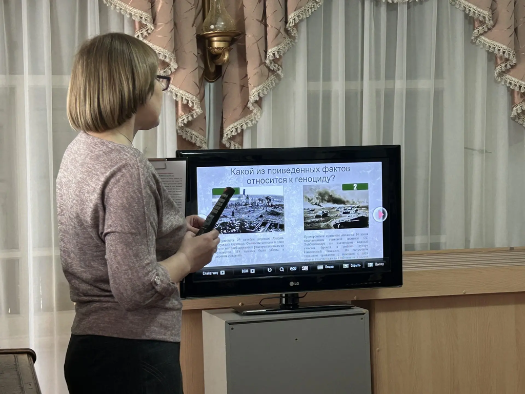На примере немецких концентрационных лагерей обучающиеся узнали о фактах массового уничтожения мирного населения фашистами, о том, как ни в чем неповинные люди стали жертвами преступлений нацистов, о трагедии, которая коснулась мирного населения СССР в период Великой Отечественной войны 1941-1945 гг. Через мини-тест «Какой из приведенных фактов относится к геноциду?» ребята закрепили полученные знания.